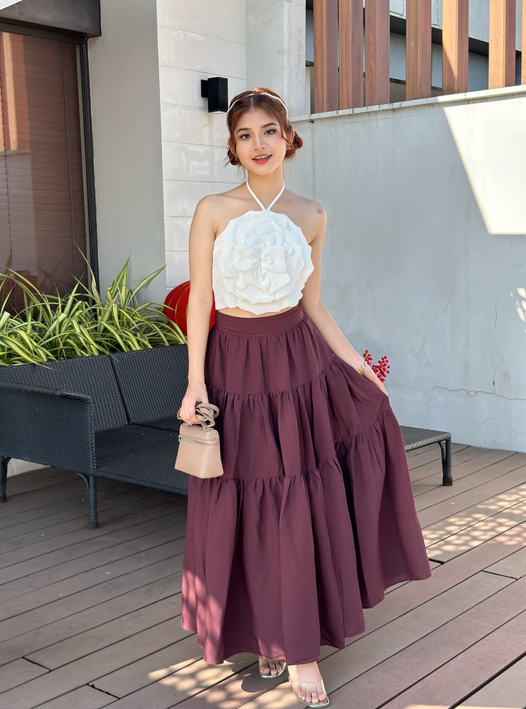 Front: Statement 3D flower piece, fitted waist, cropped length