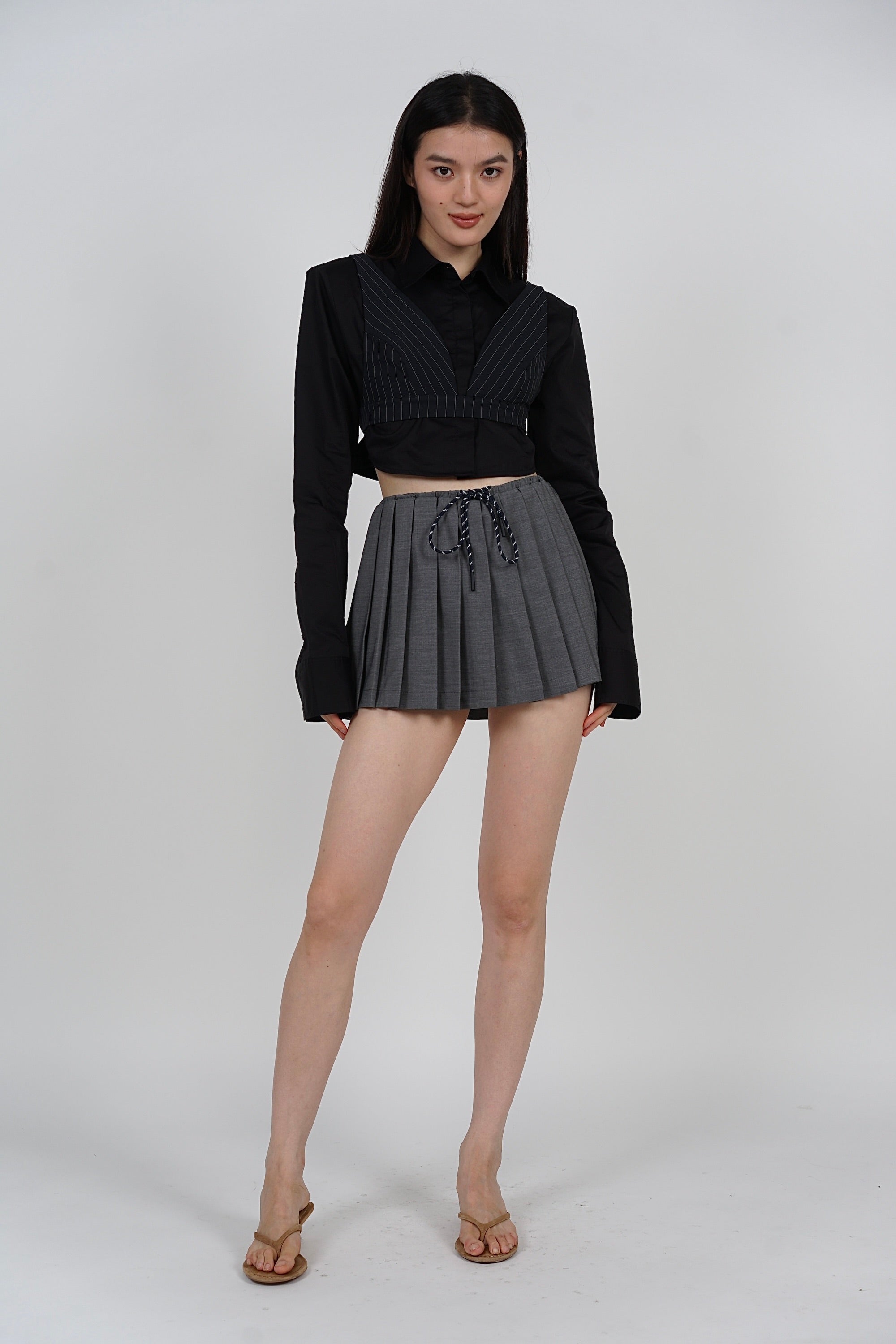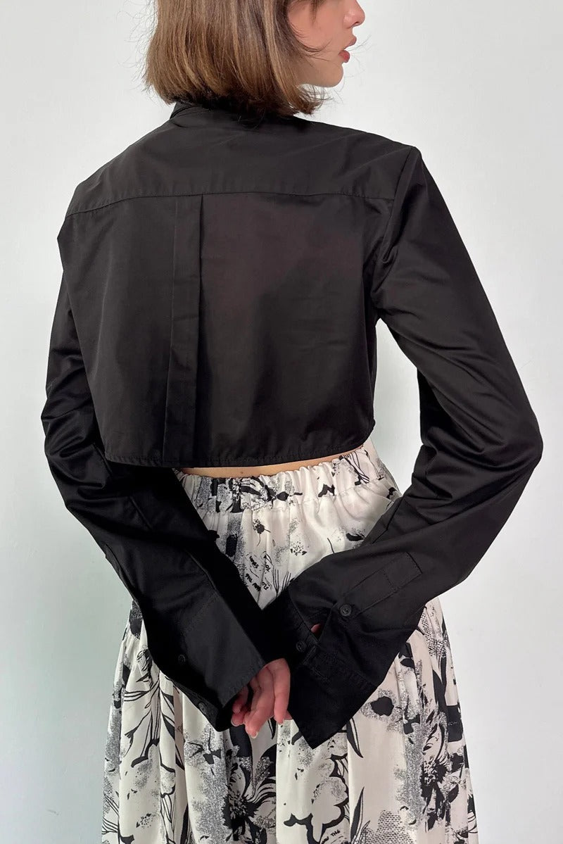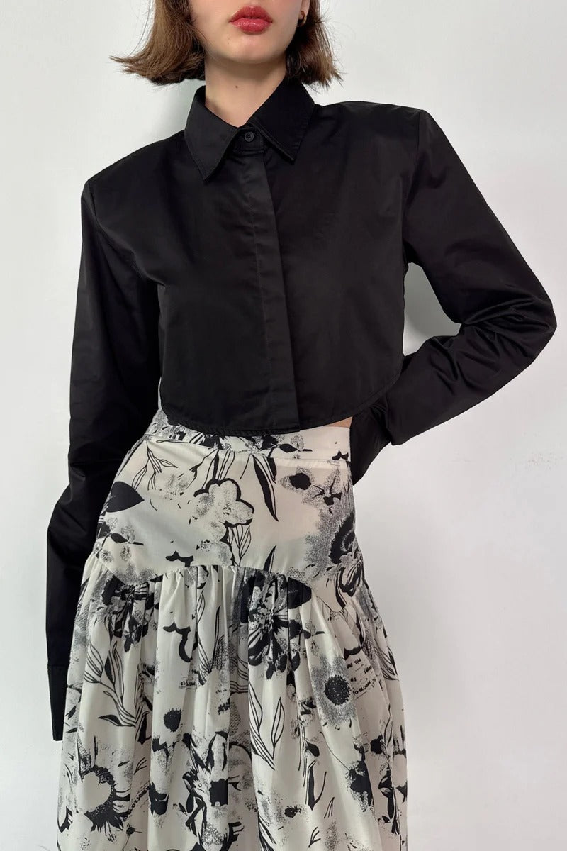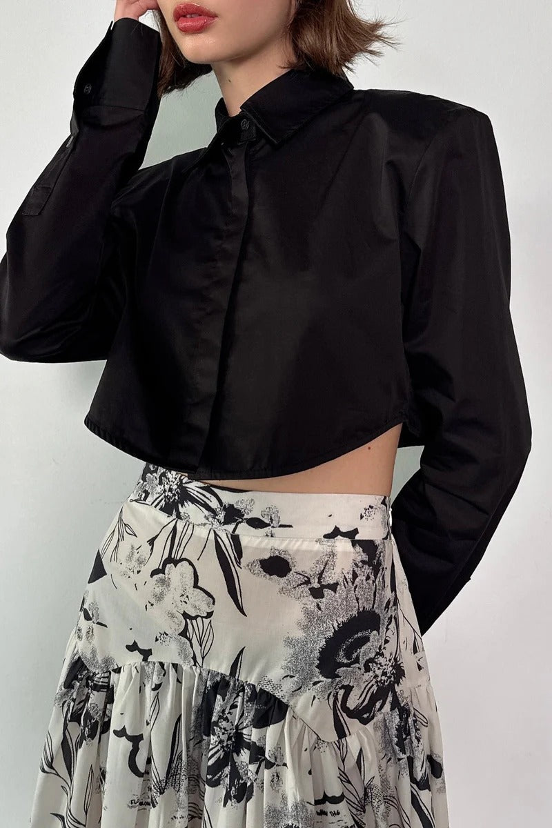 Front: Classic collar shirt, button down closure, curve hemline, cropped length