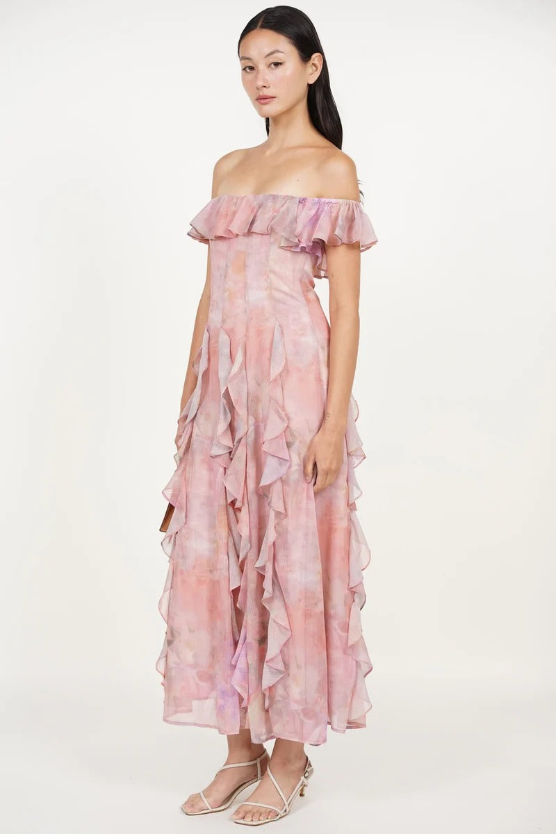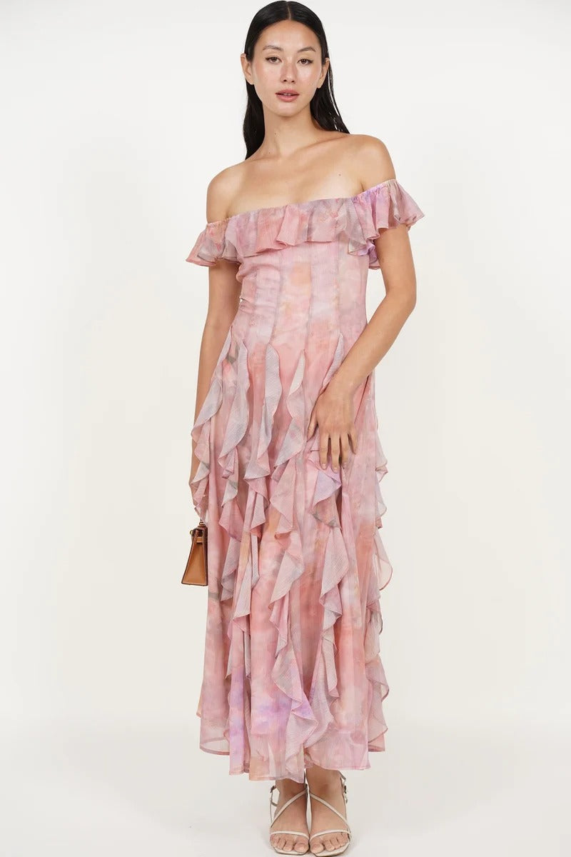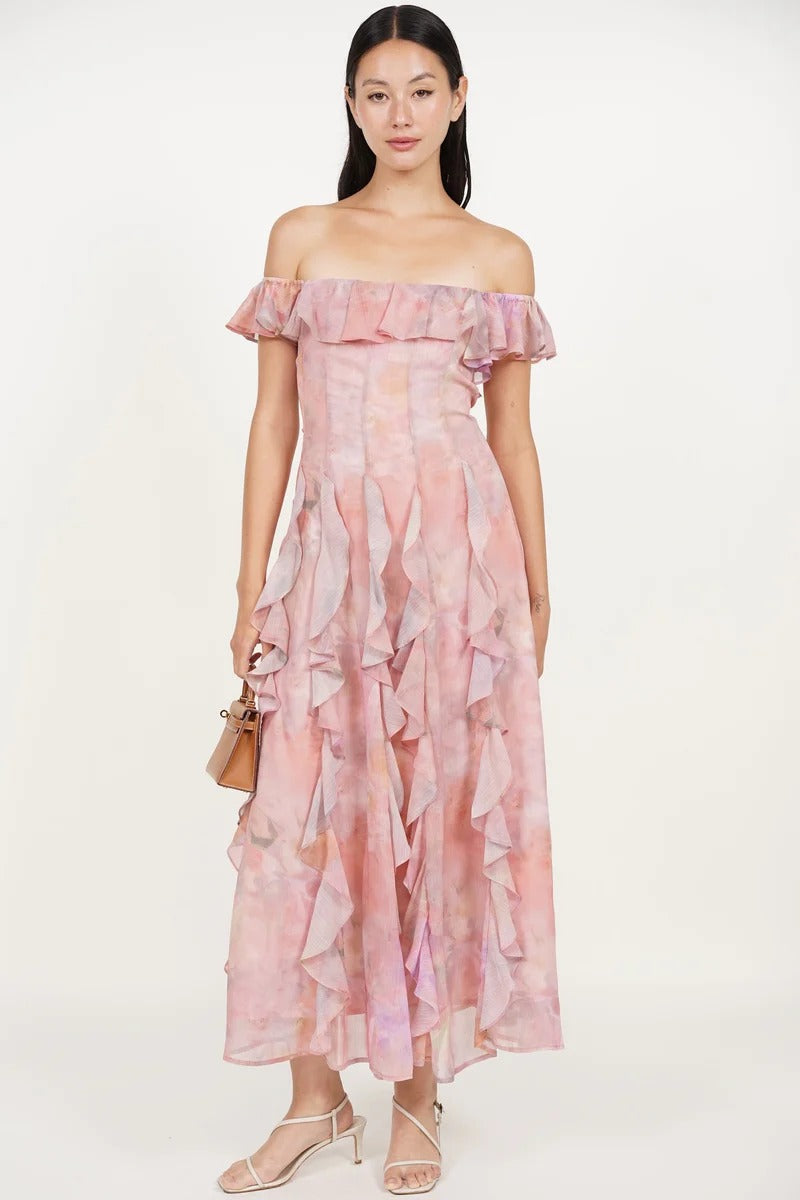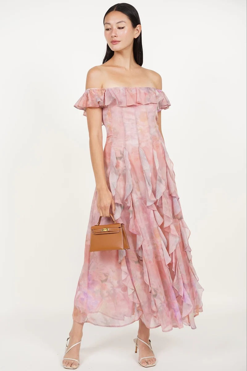 Front: Versatile, can be worn on or off the shoulder, anti-slip on neckline, cascading ruffle panels, flare hem, maxi length