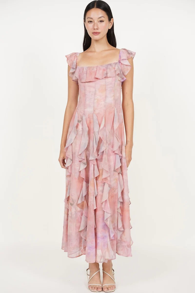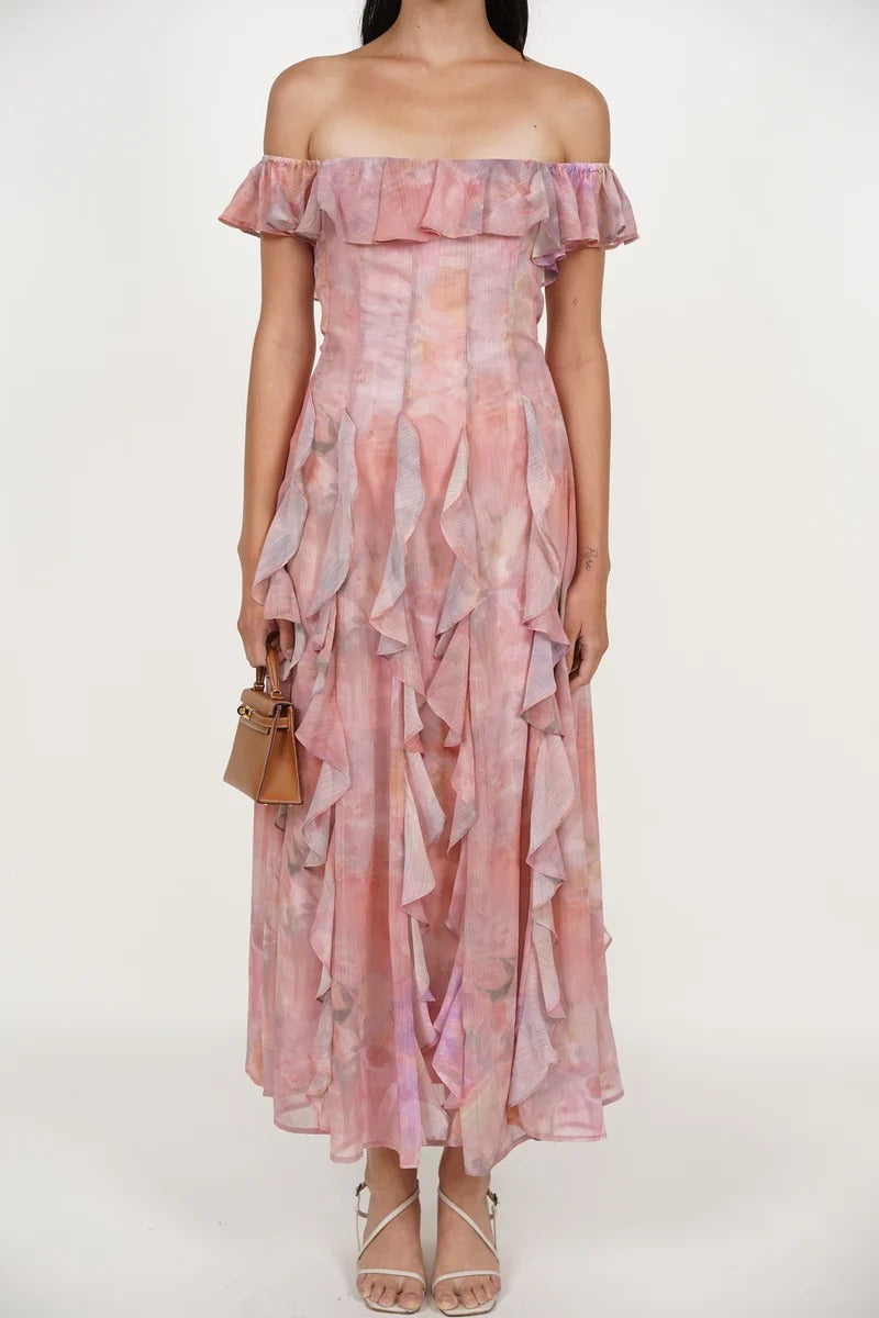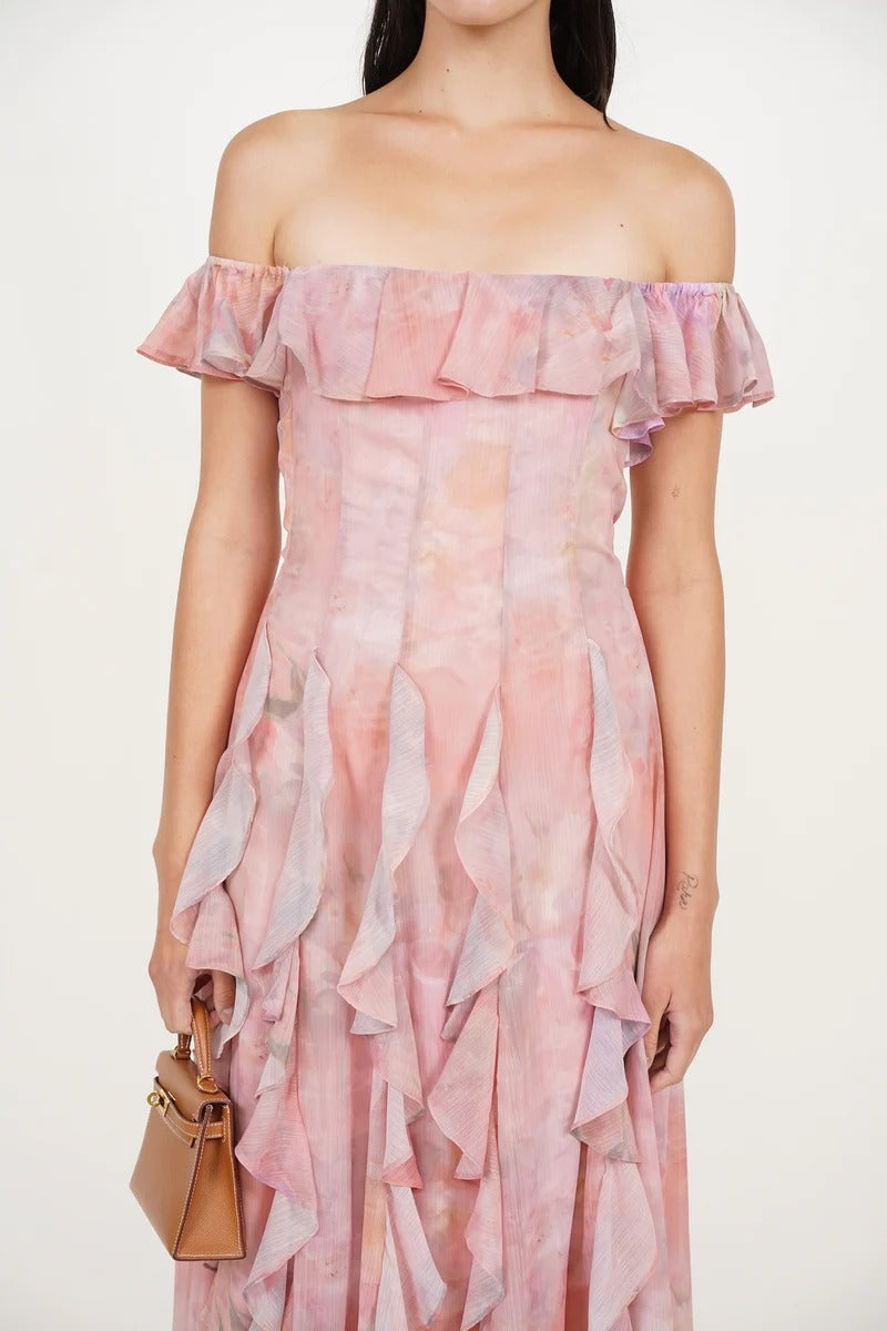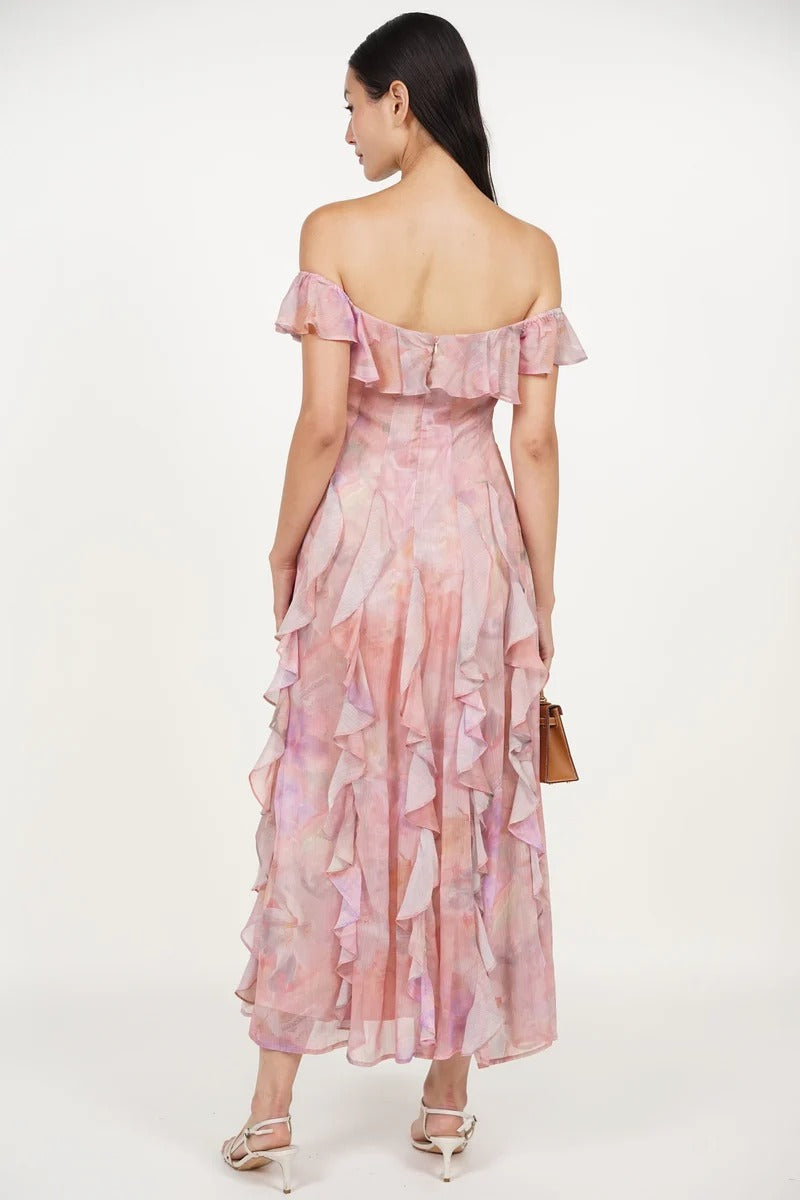 Front: Versatile, can be worn on or off the shoulder, anti-slip on neckline, cascading ruffle panels, flare hem, maxi length